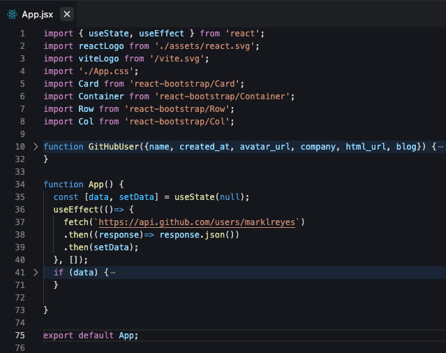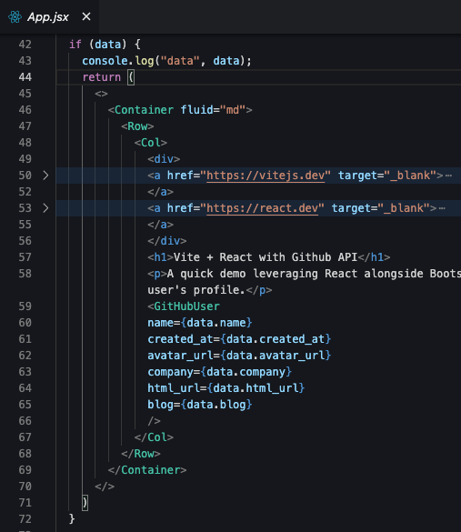 - Line 59 - 65: Once the conditional (line 41, 72) evaluates to true, the data object will be available for props to be passed into the GitHubUser component.
