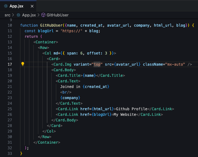 Line 10: pass in the props of your choice for display. In my case, name, created at, avatar url, company, html url and blog keys have the values I want to display as HTML elements on the page.
